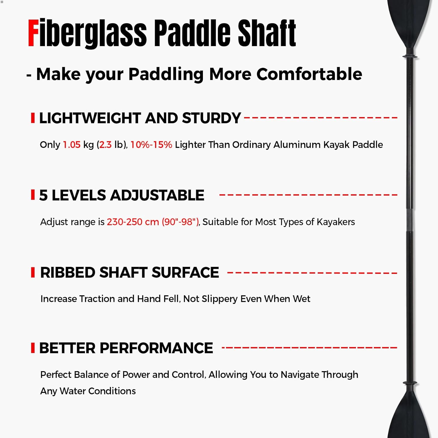 - Fiberglass SHAFT KAYAK PADDLE --- The fiberglass shaft contributes to the lightweight of the whole paddle. It’s stiff yet with certain flexibility required to maintain better performance and protect the shaft from breaking under extremely powerful stroke and increases traction and comfort for the hand